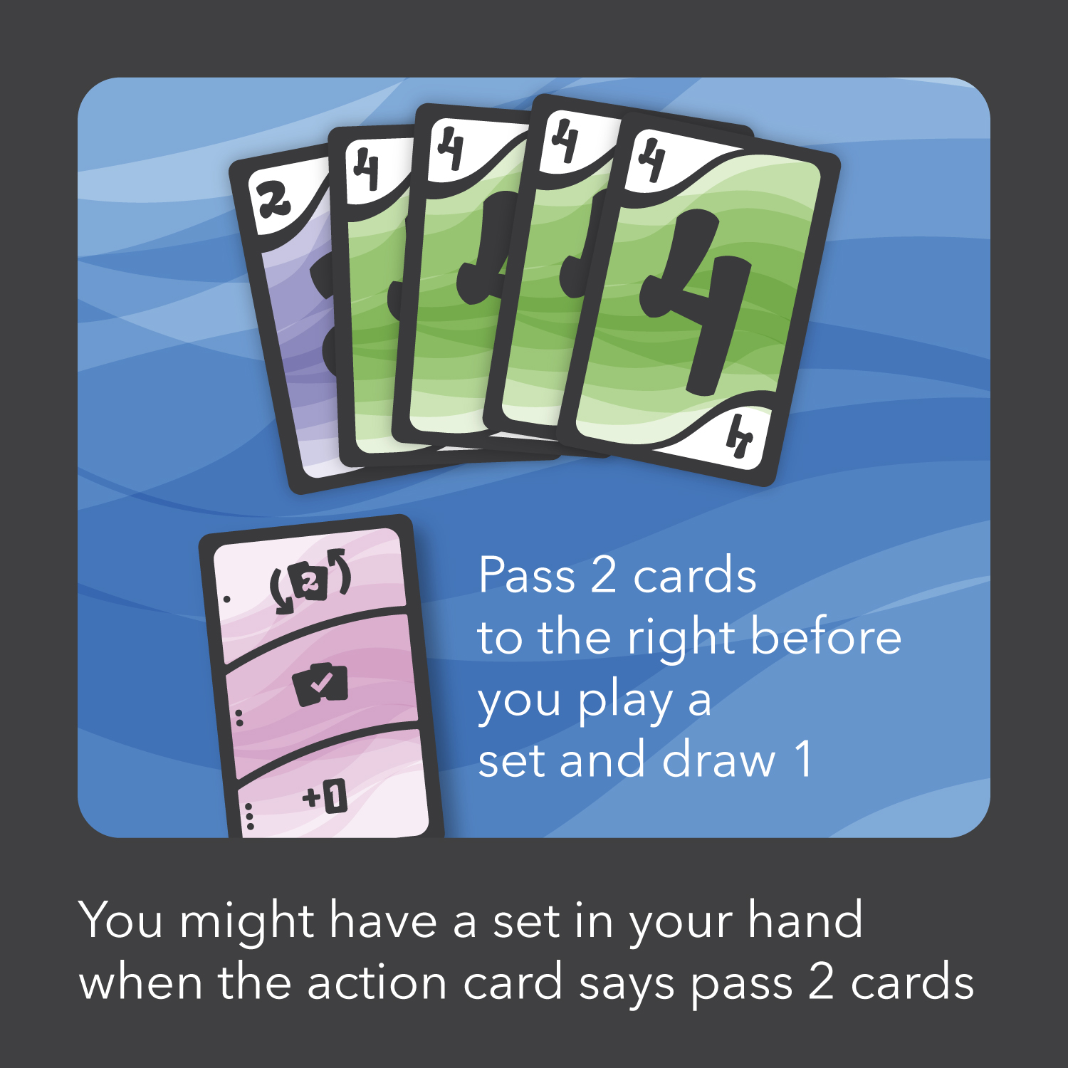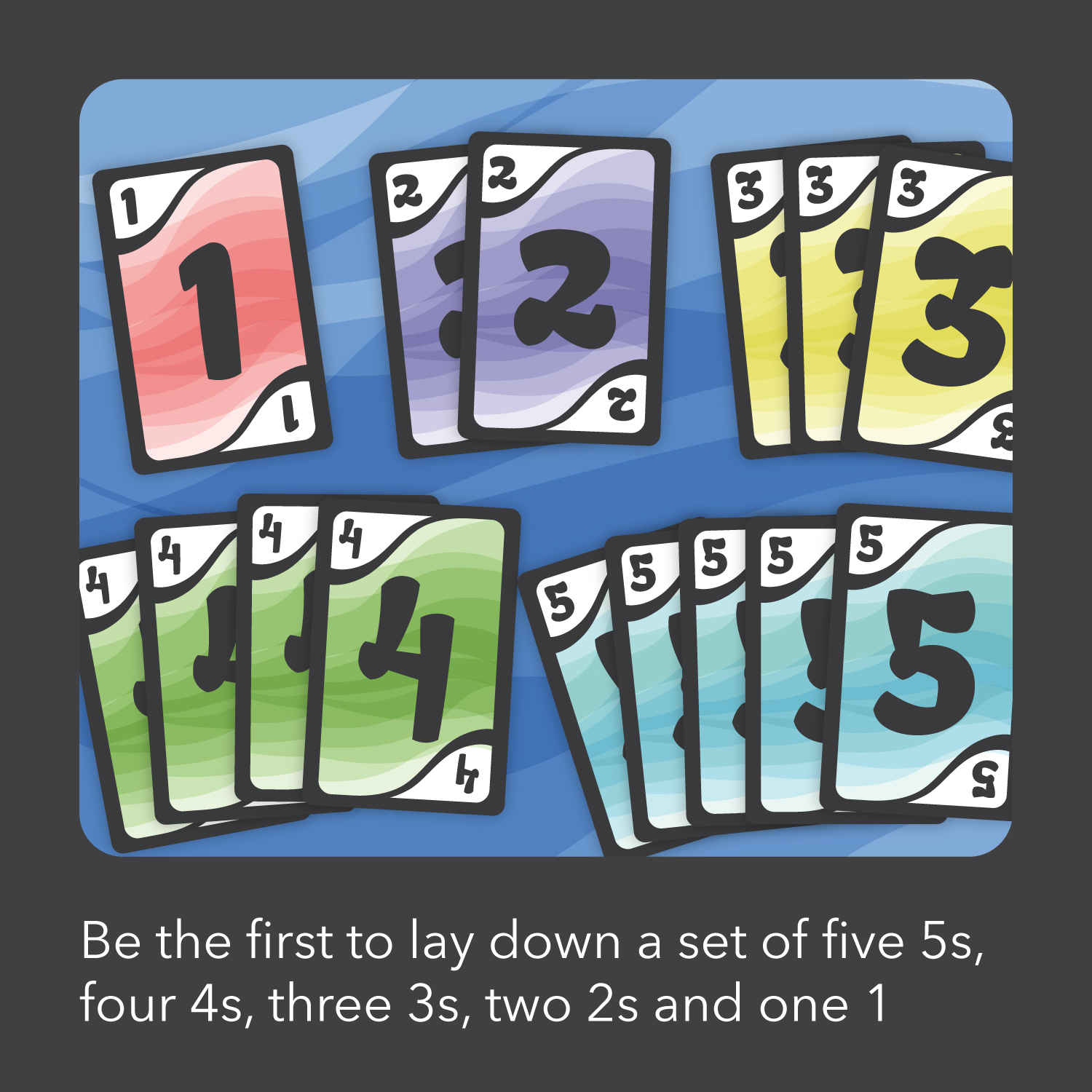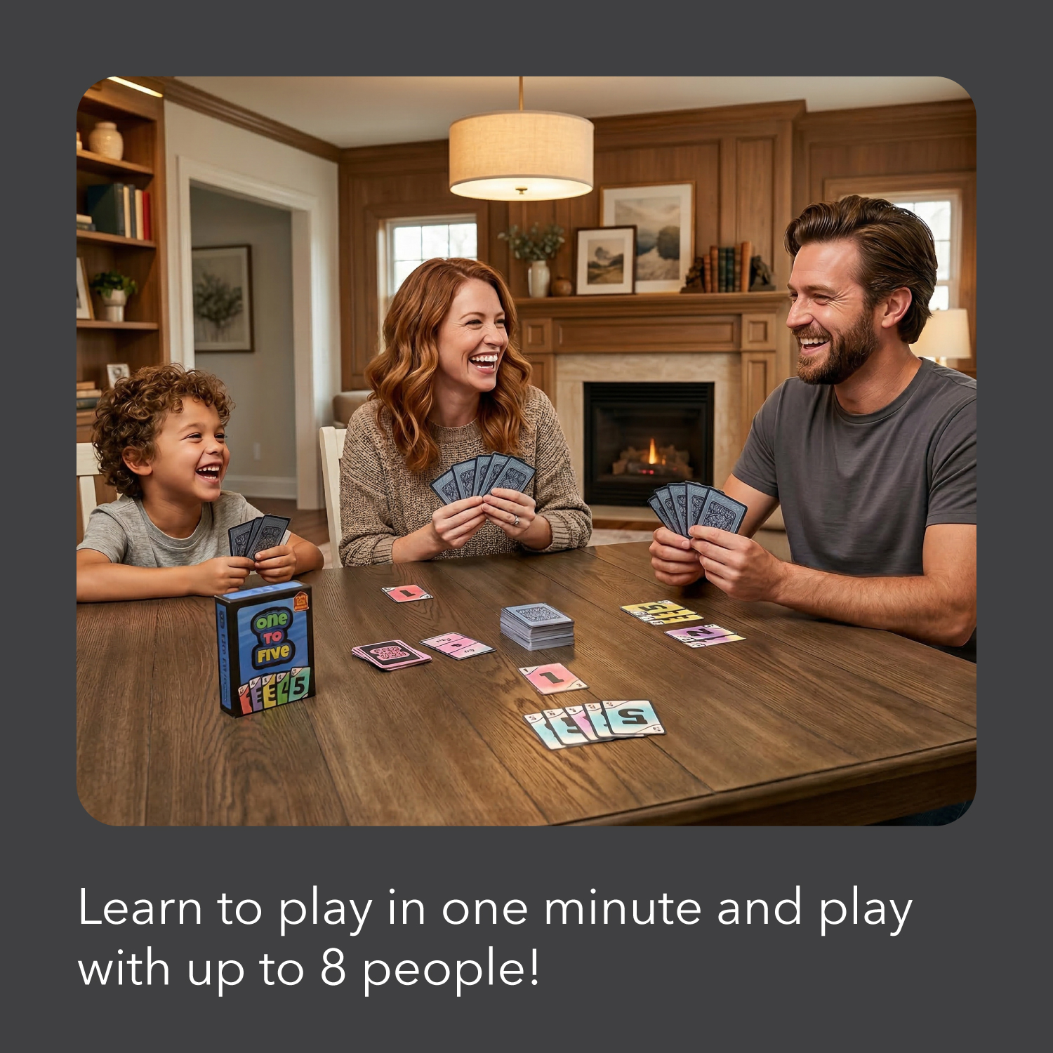 One to Five is a high energy game that will have you laying down sets of cards from 1 to 5, (5 fives, 4 fours, 3 threes, etc). The first player to lay down all 5 sets wins. The deck of Action Cards determine what all players will do in each round. You might draw a card, play a set, then pass a card to the right. Or you might draw exactly the card you need but have to pass your whole hand to the left before you get a chance to play your completed set! Every game is different, exciting and unpredictable. One to Five will have your whole table laughing, wanting to play again and again.