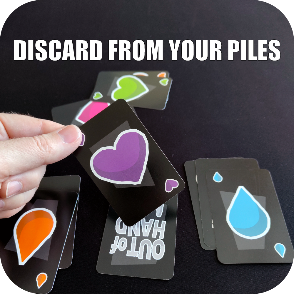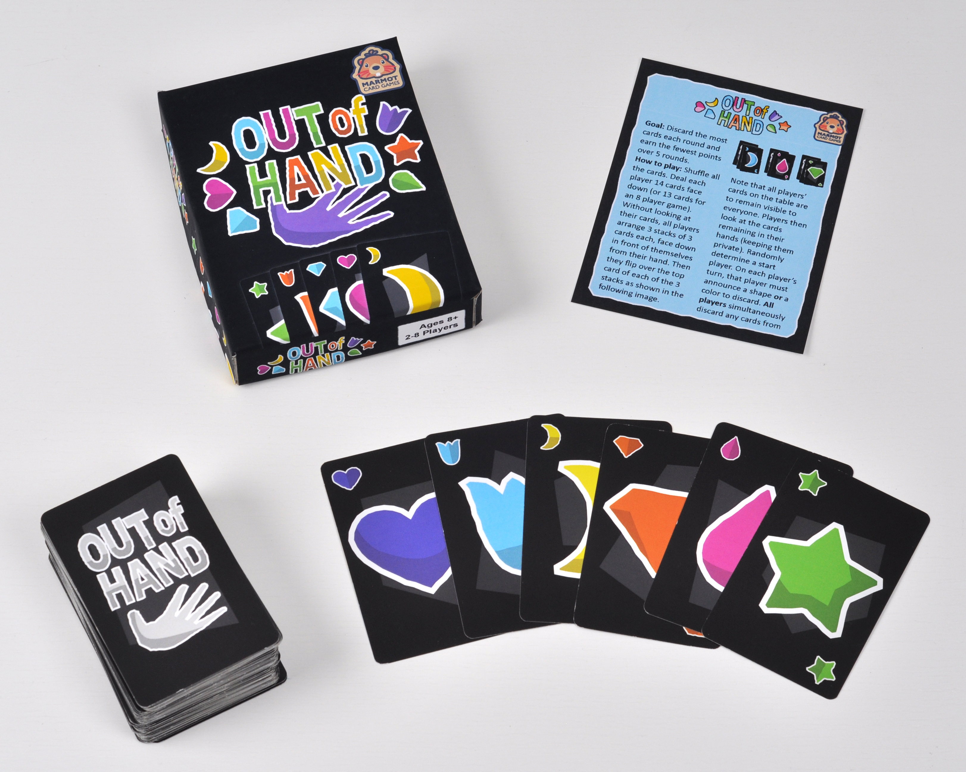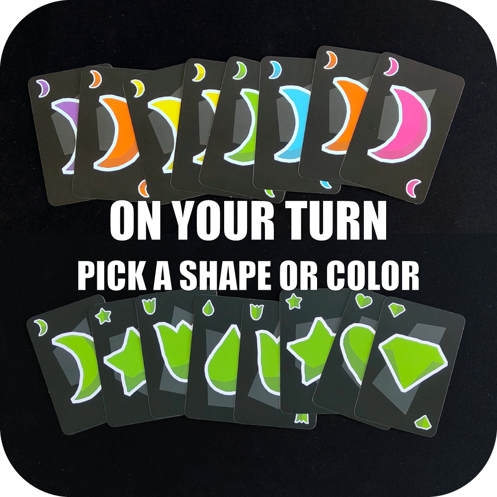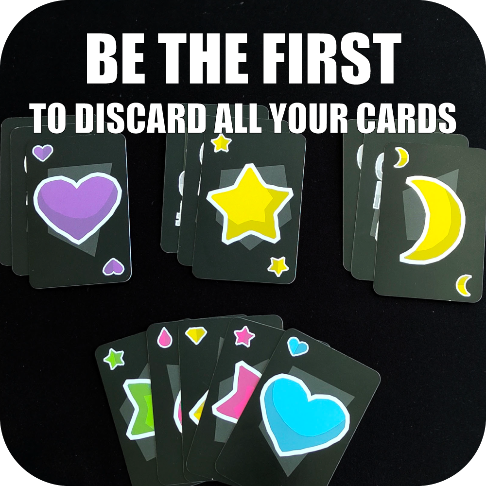 In this fast and easy to learn card game, you’ll try to get rid of all your cards before everyone else. On your turn you will simply call out a shape or color and discard all of your cards that match. But watch out, all your opponents can also discard their matching cards. Some of your cards are held private in your hand, but others are face up on the table for everyone to see. You’ll need to pay attention to everyone else’s cards, remember what they discard, and have a bit of luck to run out of cards first.